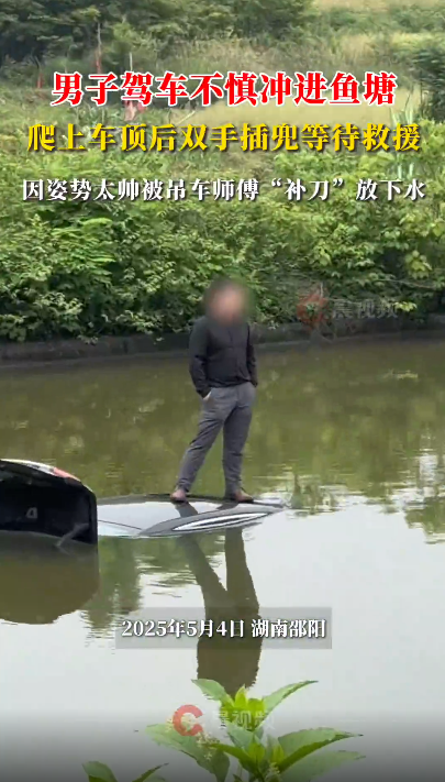 湖南一男子驾车冲入鱼塘,双手插兜等救援:我当时害怕极了